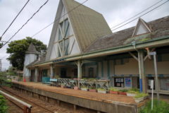 銚子に来るときに乗った「しおさい号」から見た、横芝駅の駅舎の屋根に似てる気がする。