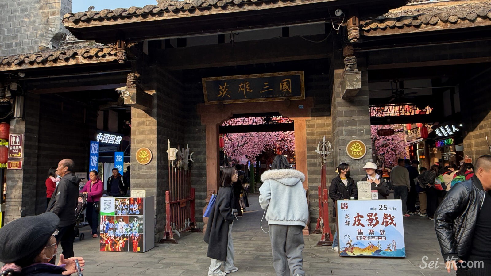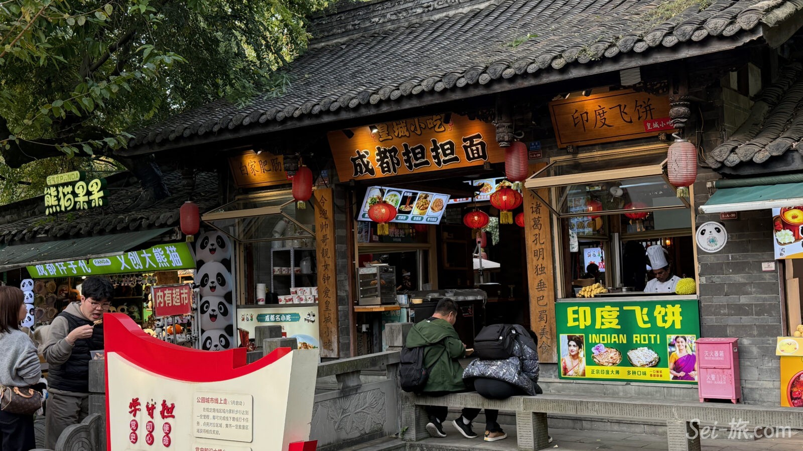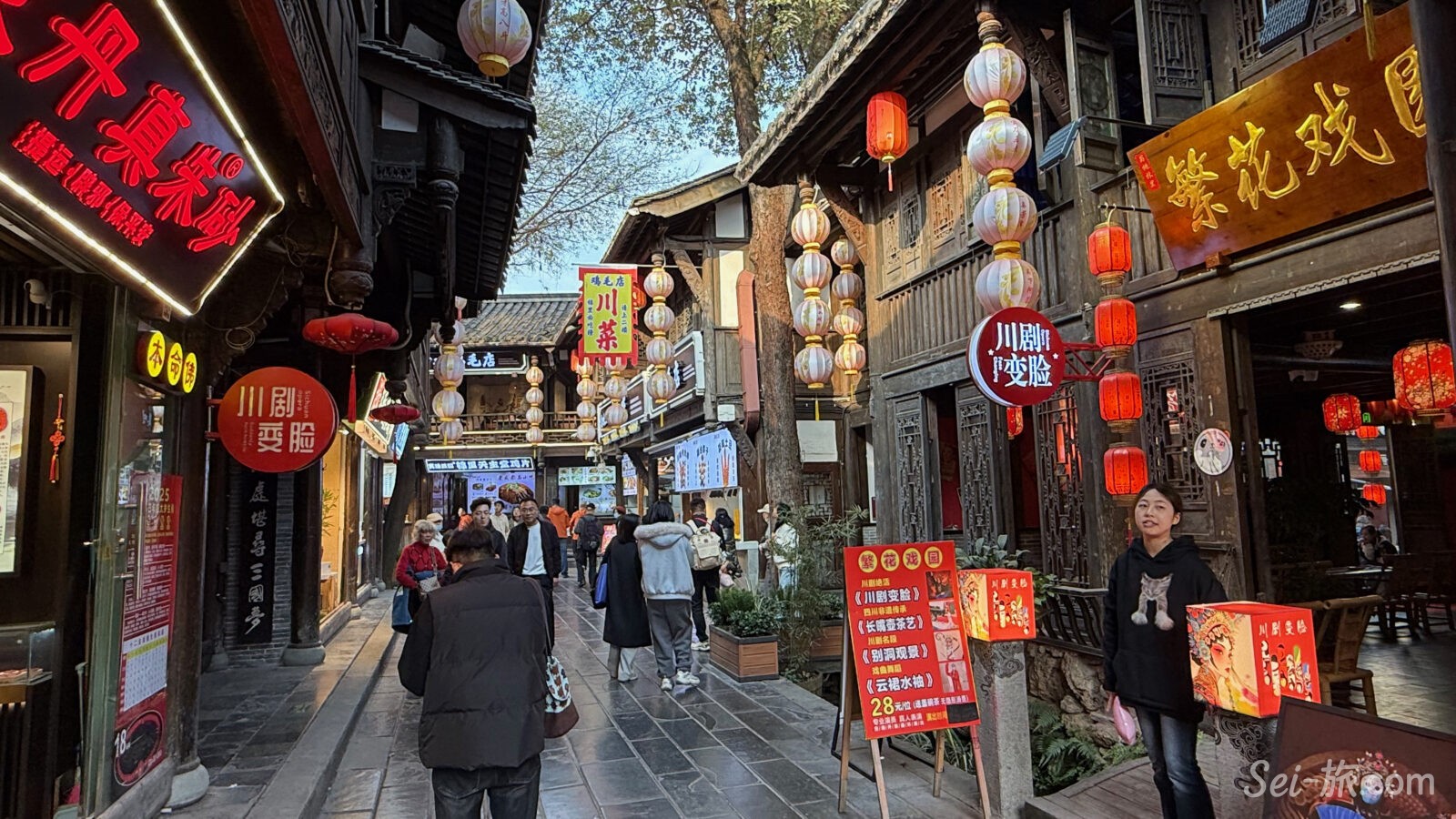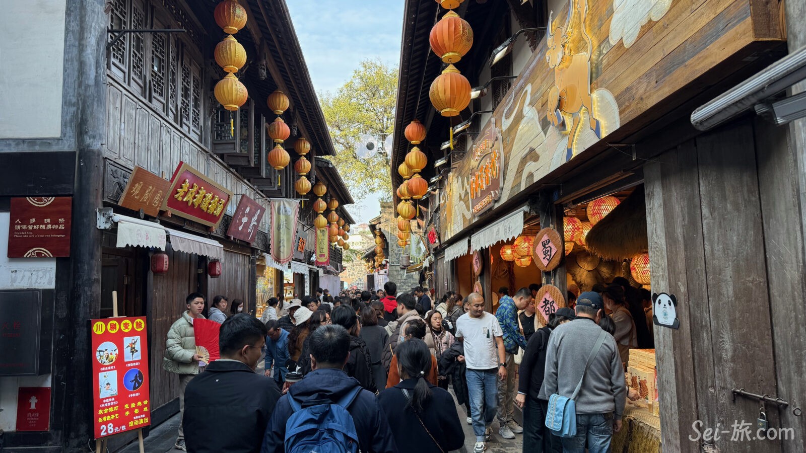 観光客であふれ、提灯が吊るされ、川劇の変臉や三国志グッズが並ぶ、歩いてとても楽しい老街。