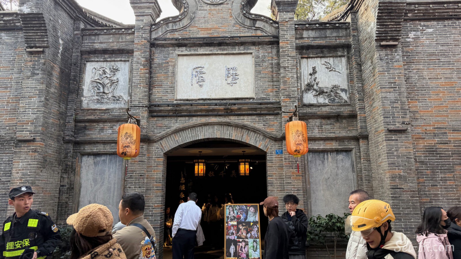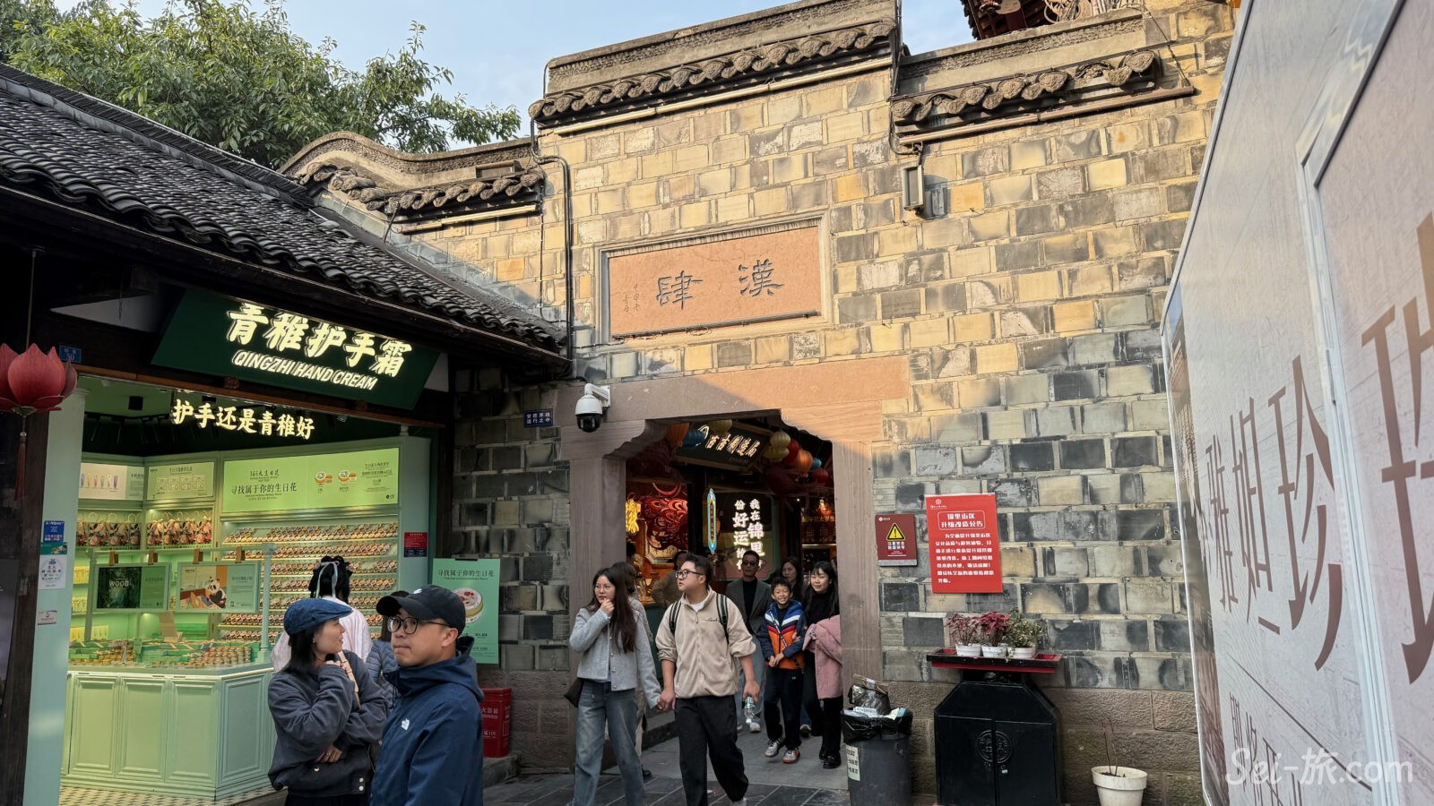 観光地化された歴史空間のなかで、家族が串を分け合い、若者が写真を撮り、老人がゆっくり歩く。