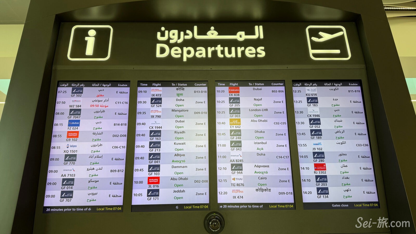 クウェートのほか、リヤド、ダンマーム、アブダビ、ジェッダ、ドバイと、アラビア半島を旅している実感のわく行き先表示。