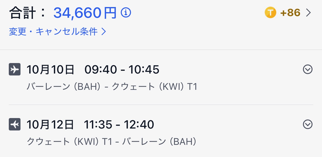 バーレーンからクウェートを往復で34,660円だから、円安のこの時期にしてはリーズナブル。