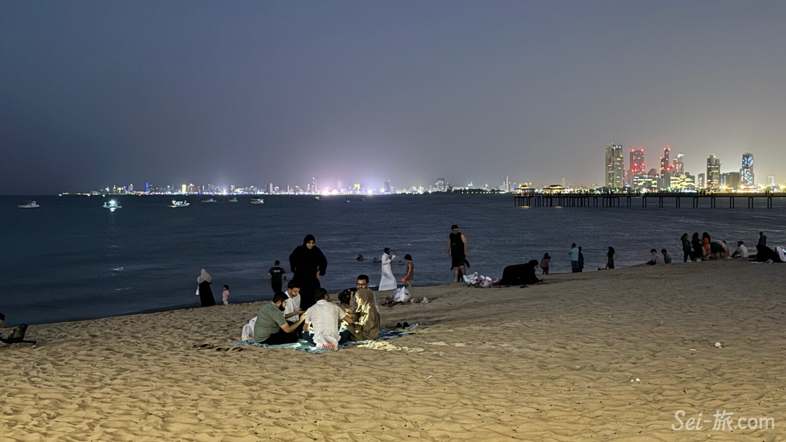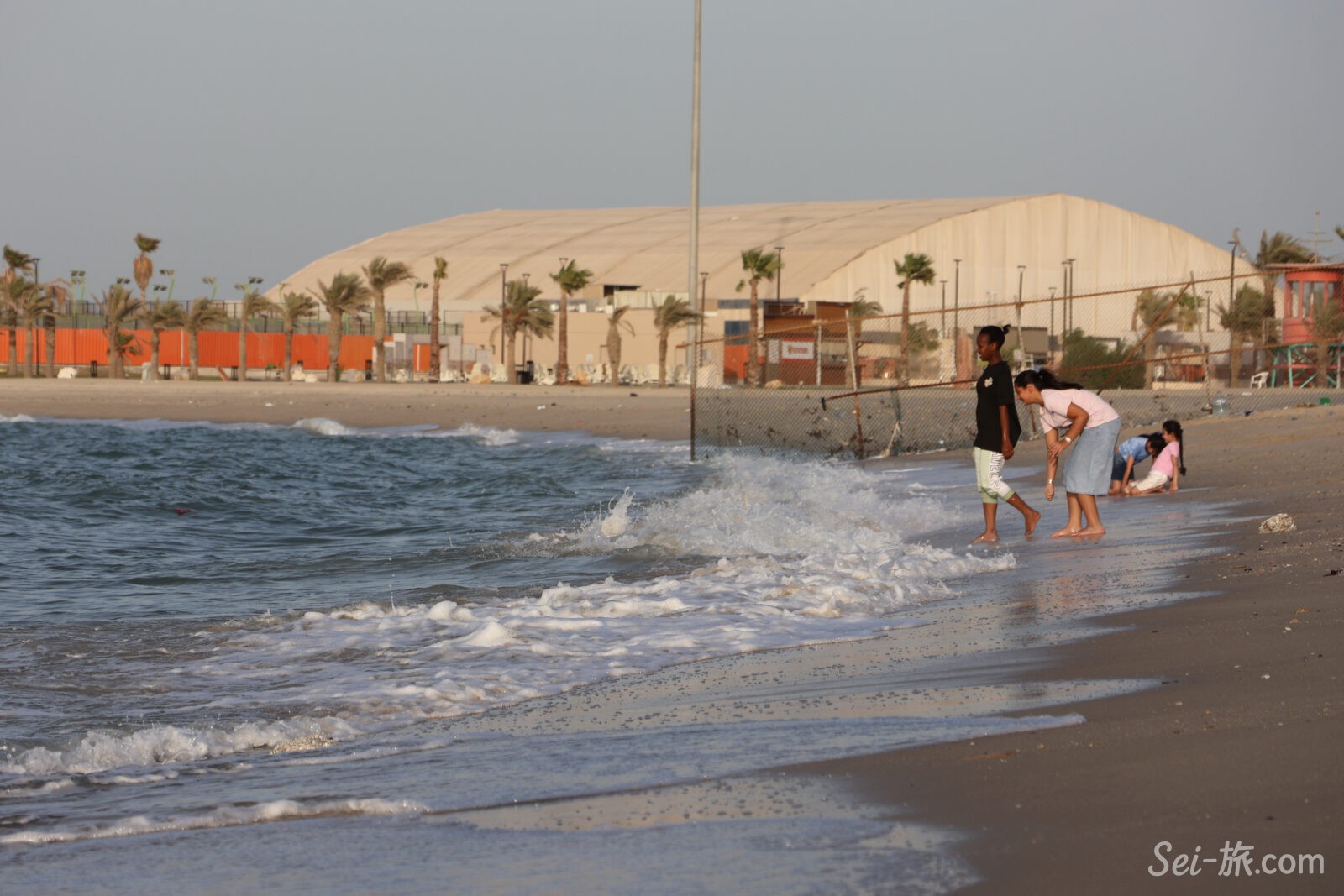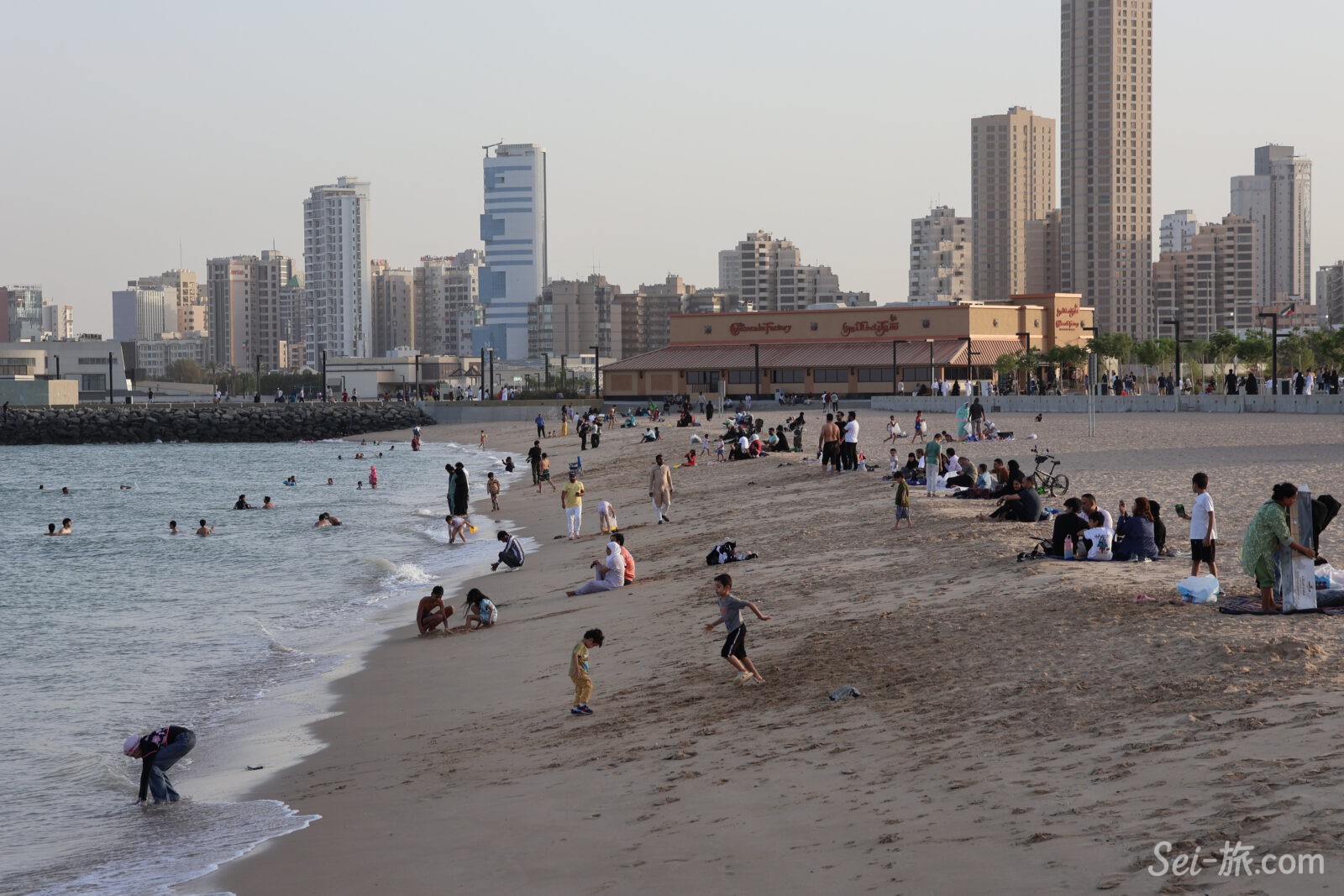 東京湾よりはるかに綺麗なペルシャ湾の波打ち際で、クウェート市民も楽しそう。