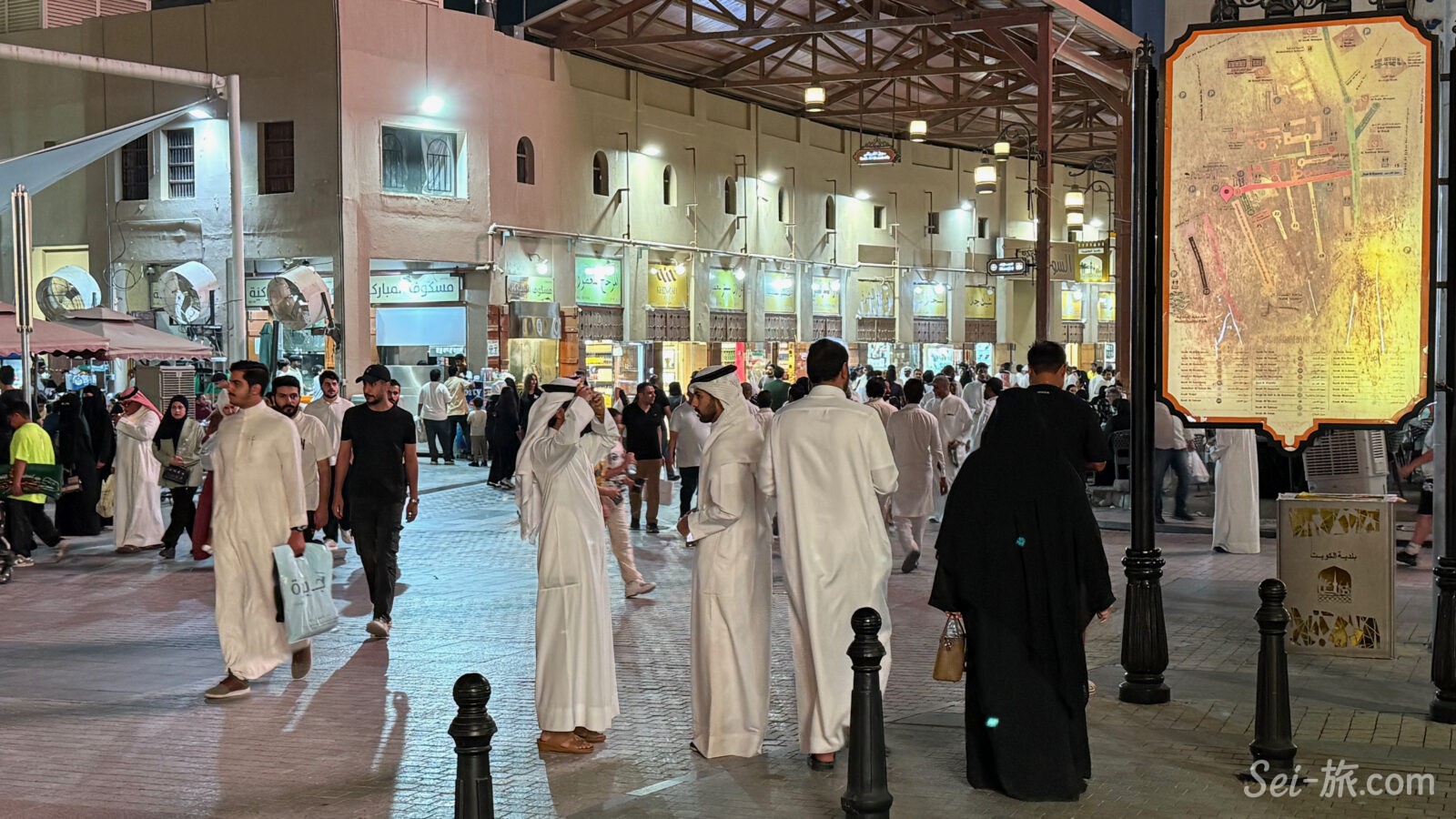 真っ白なディシュダーシャ(トーブ)を風に揺らす男性たちと、アバーヤをまとった女性たち。