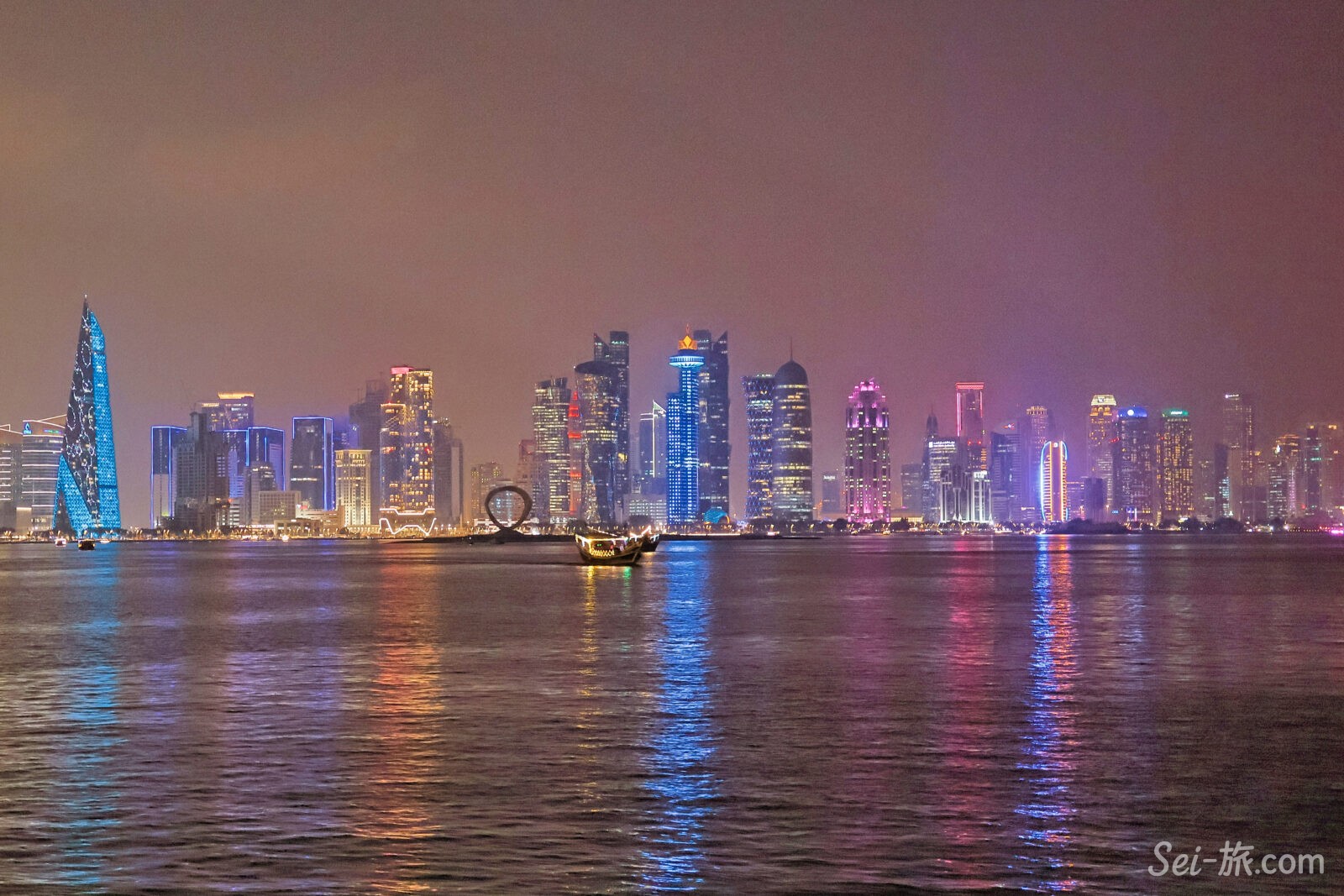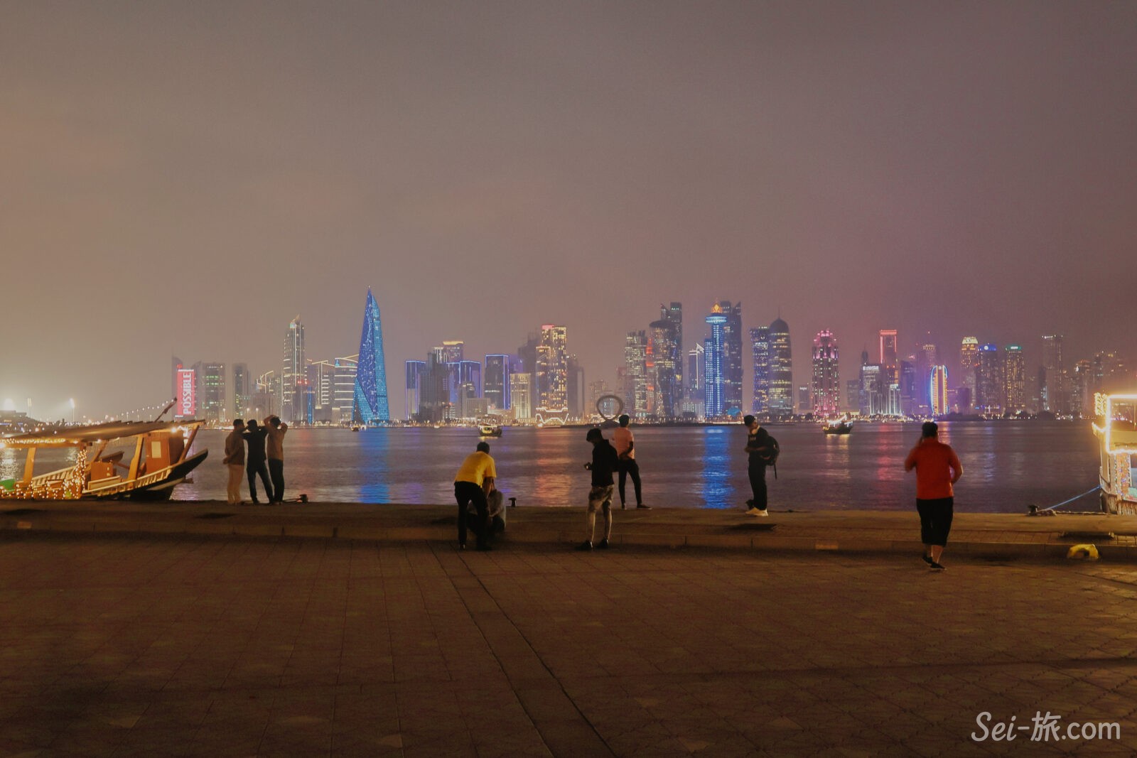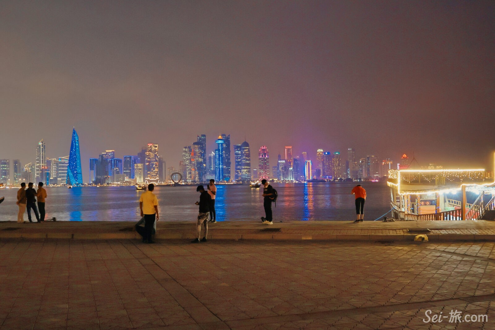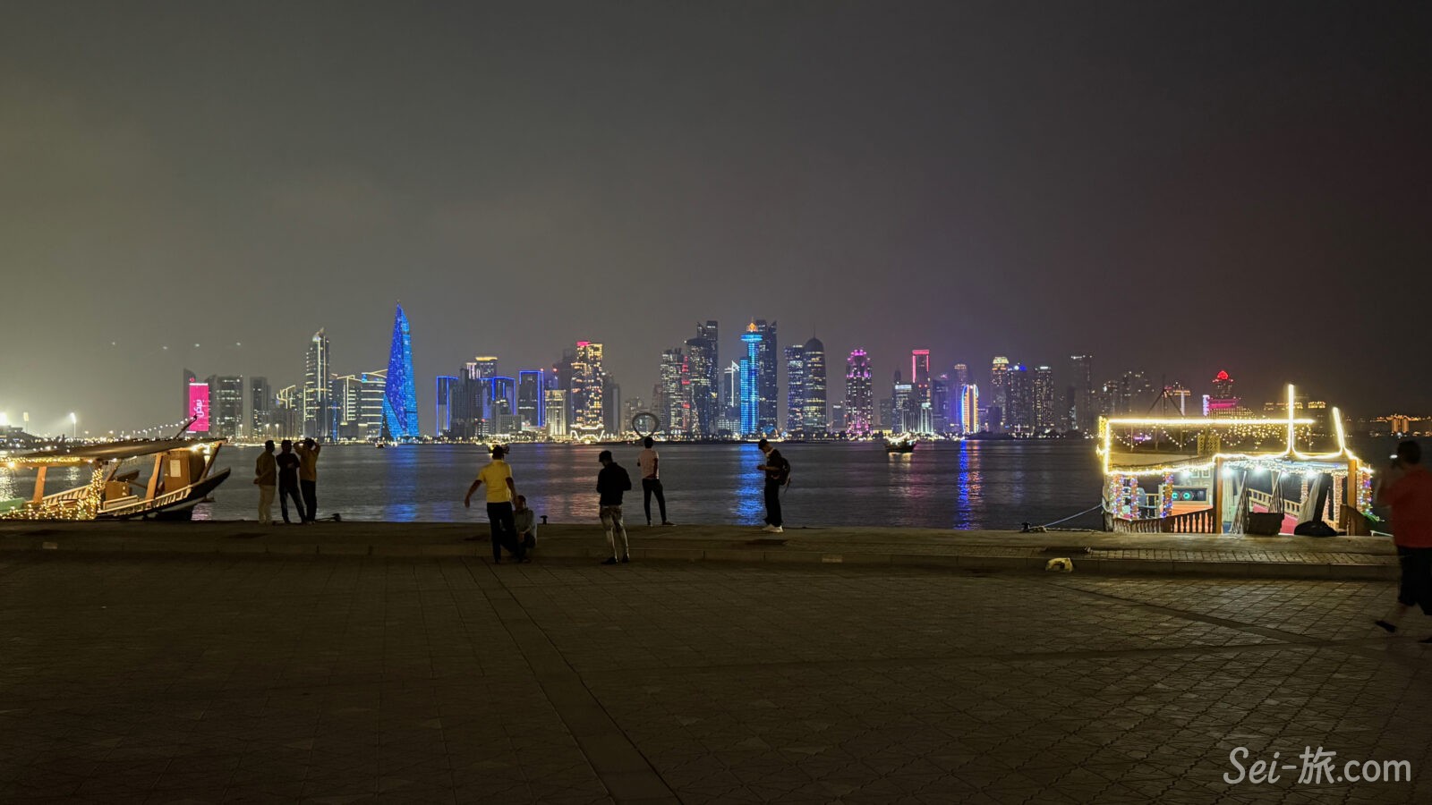 視線の先、ドーハ湾の向こう側には、光をまとった摩天楼。