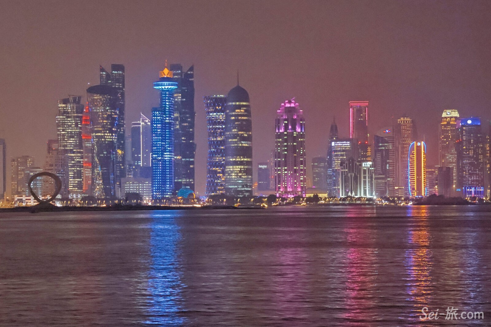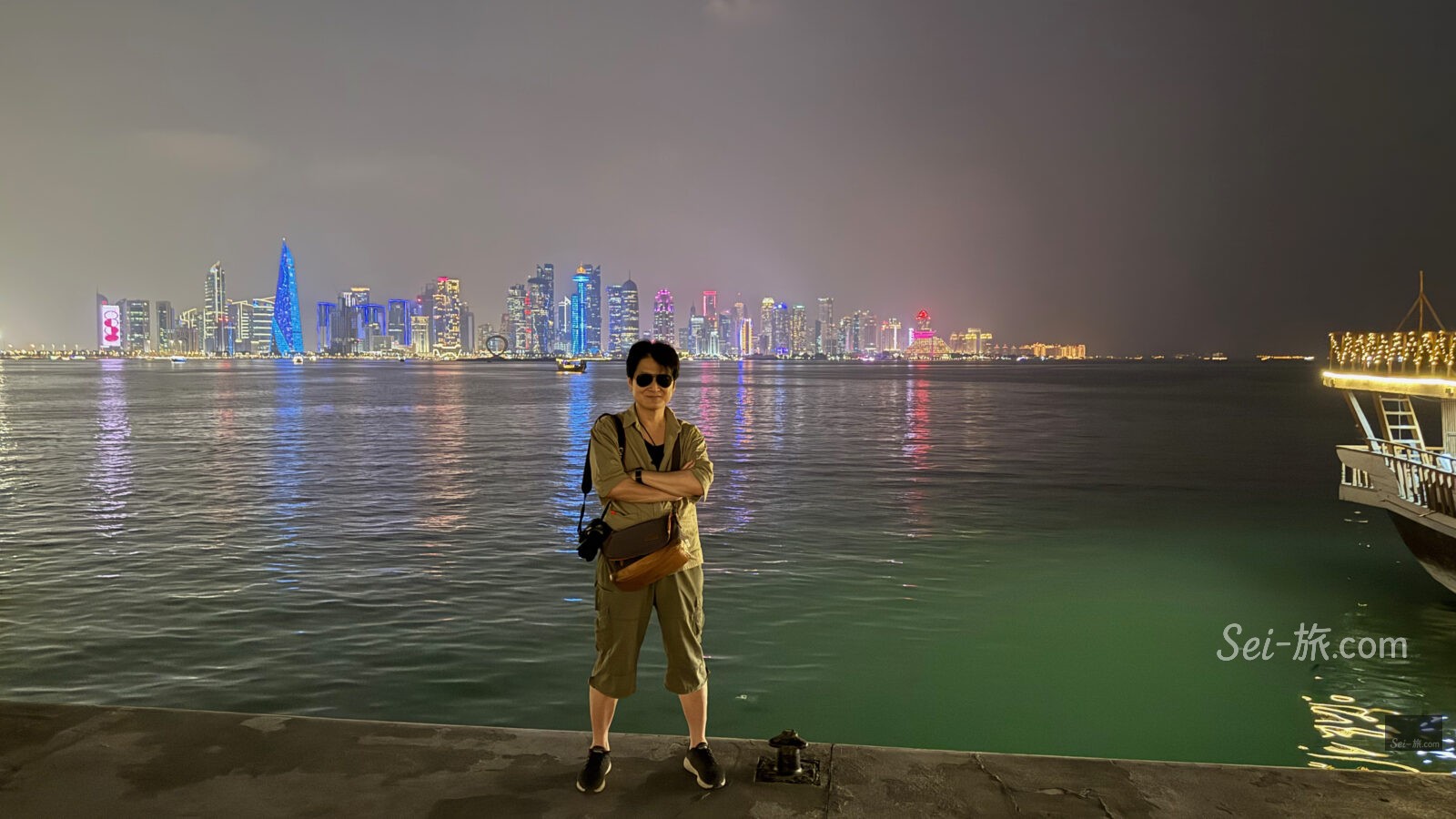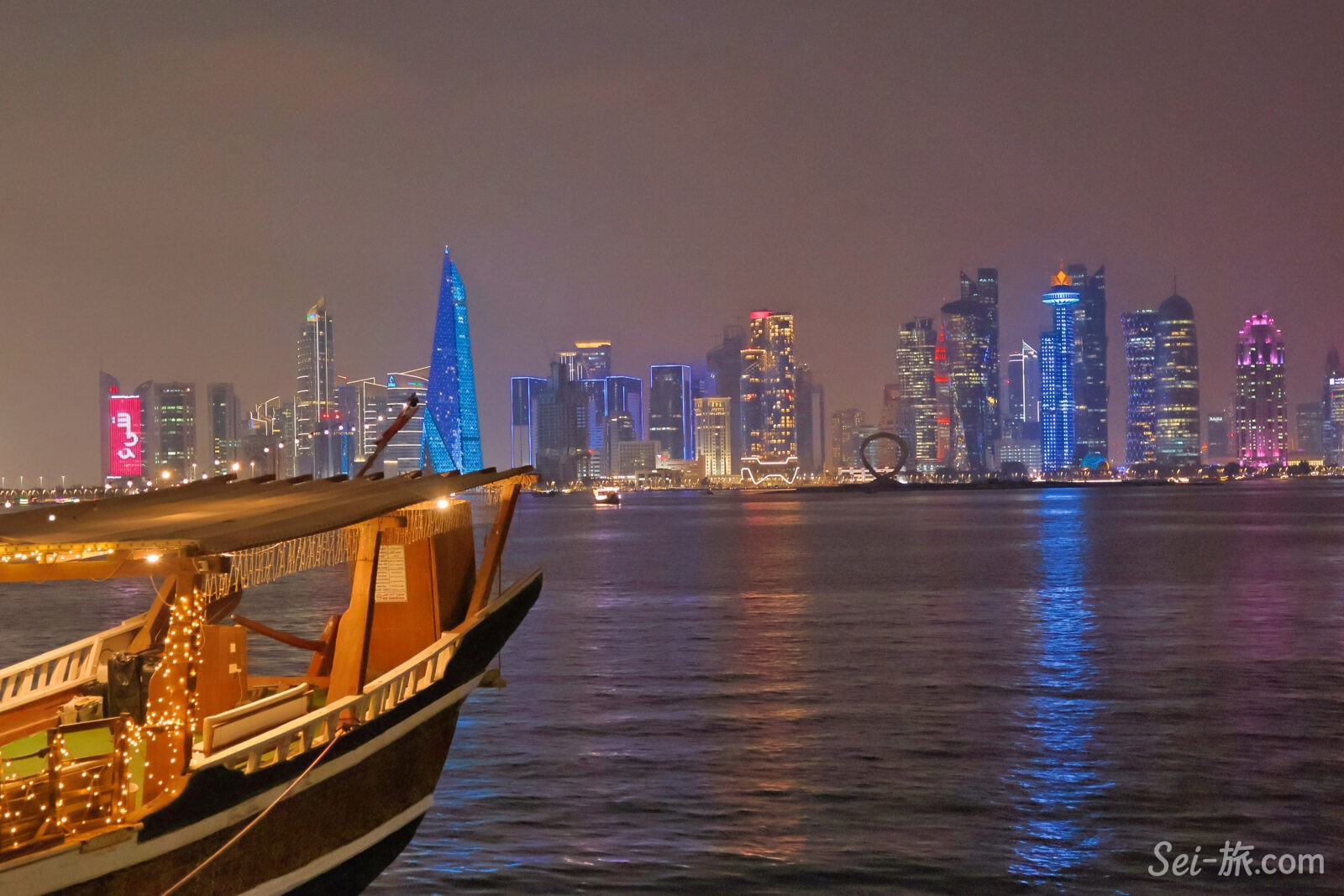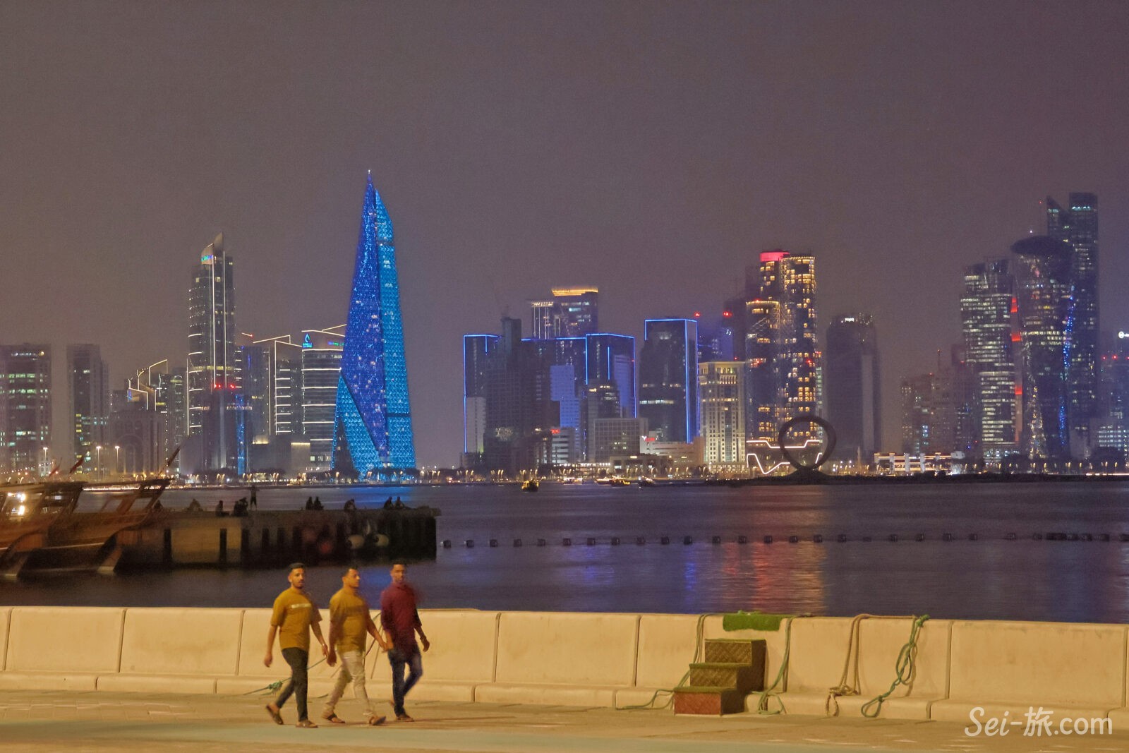 視線の先、ドーハ湾の向こう側には、光をまとった摩天楼。