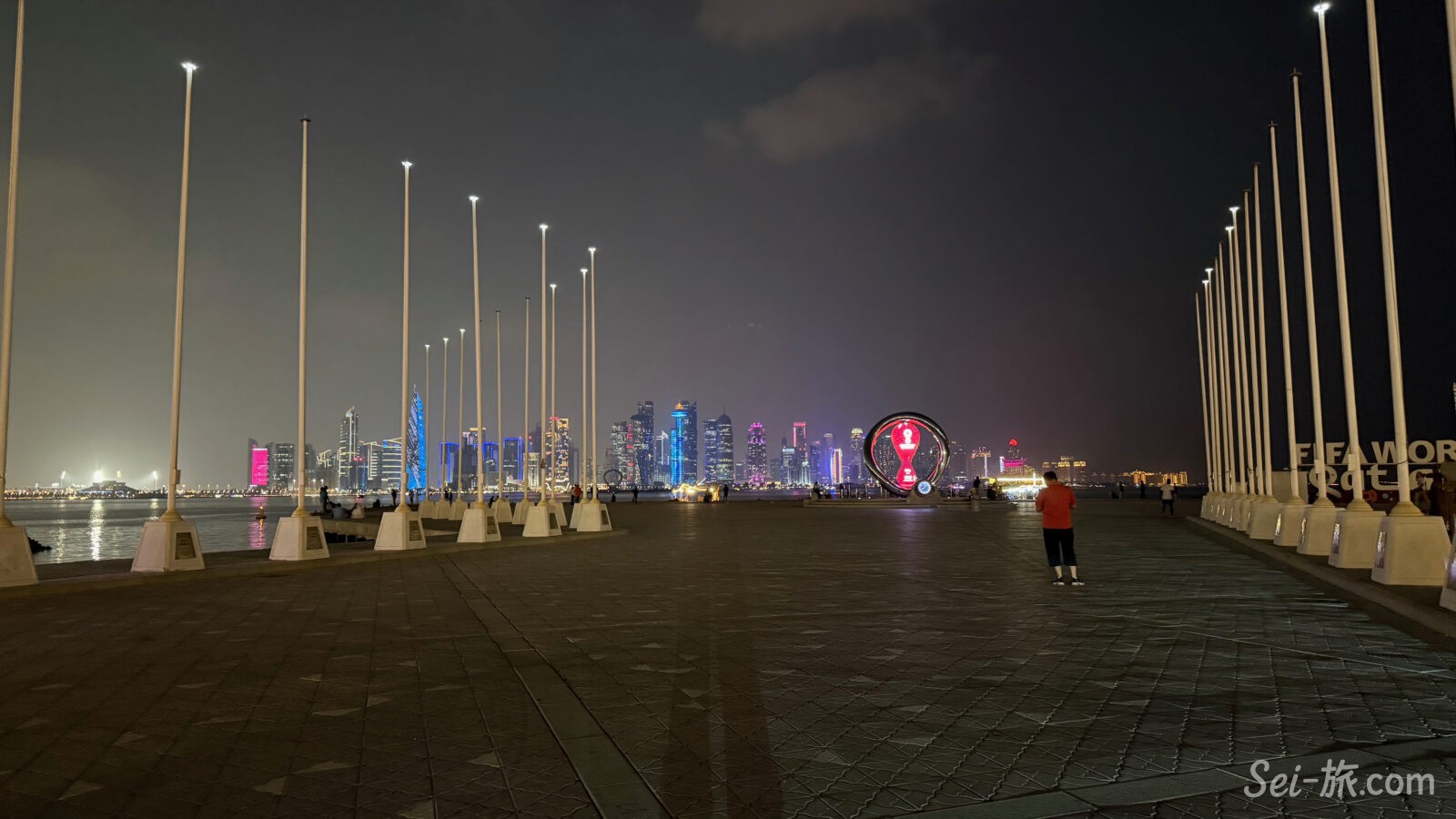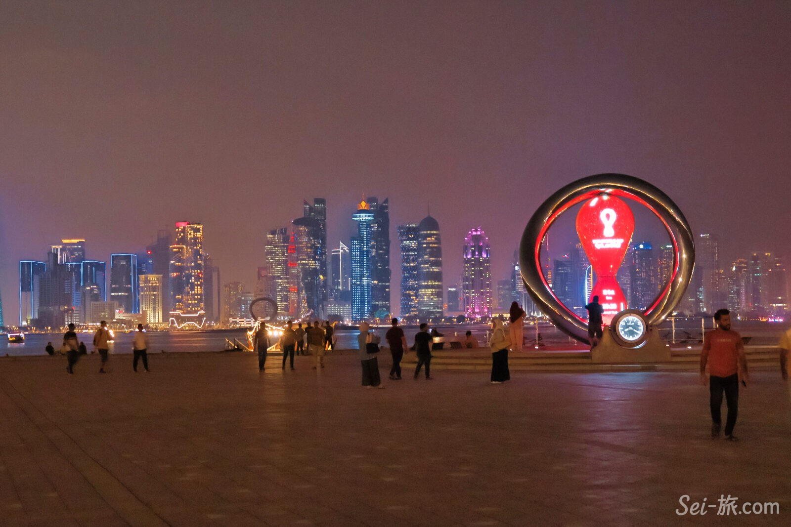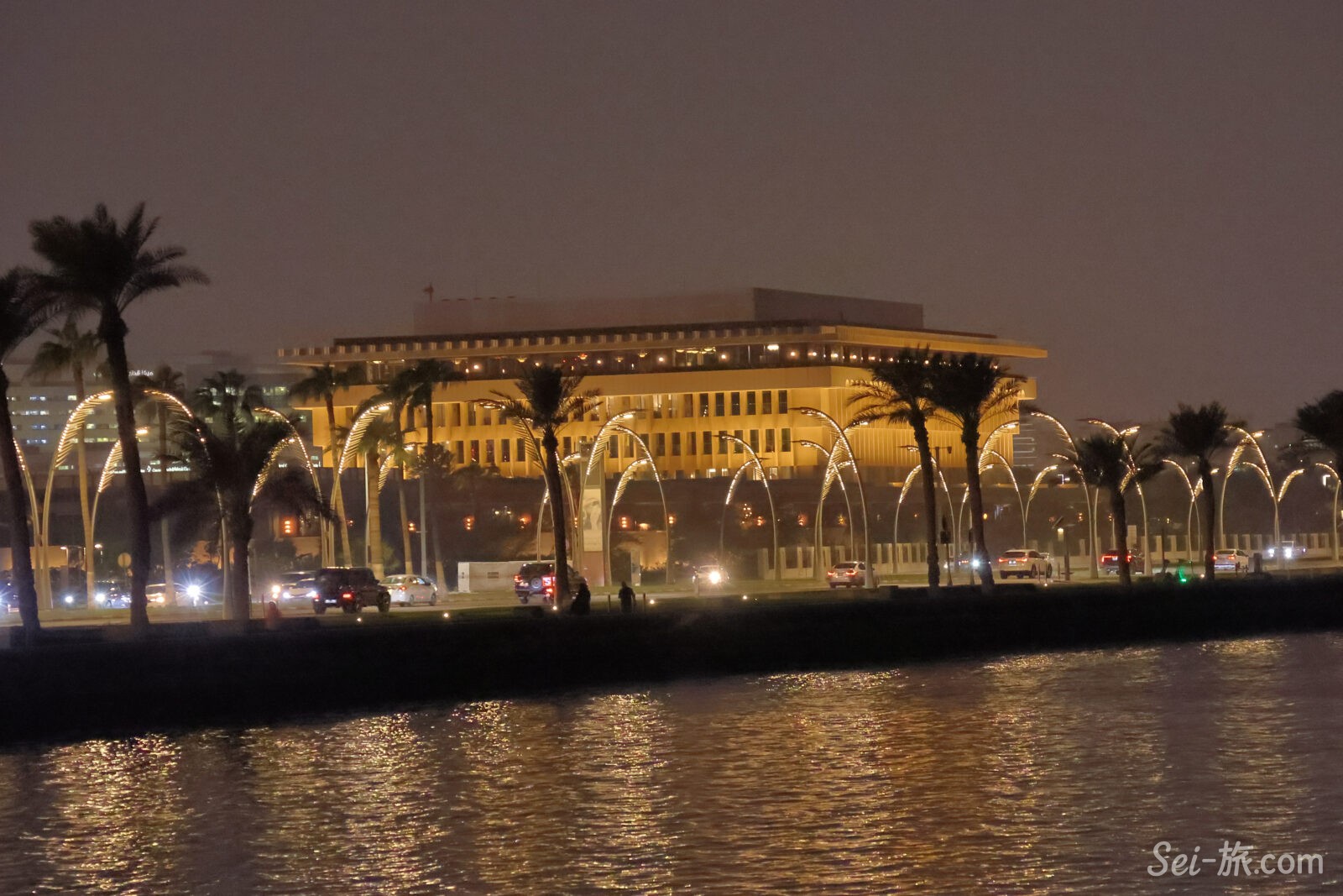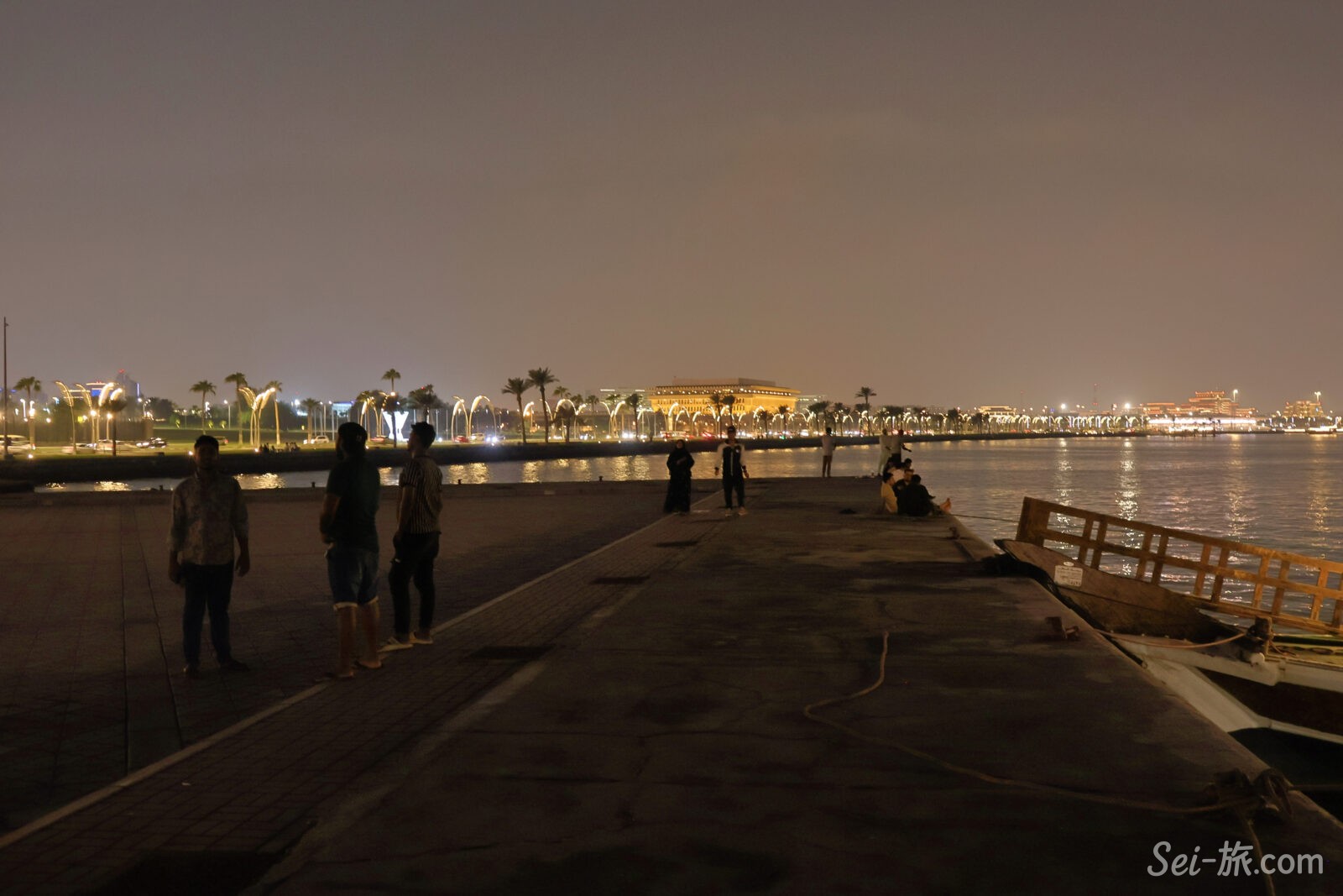 視線の先、ドーハ湾の向こう側には、光をまとった摩天楼。