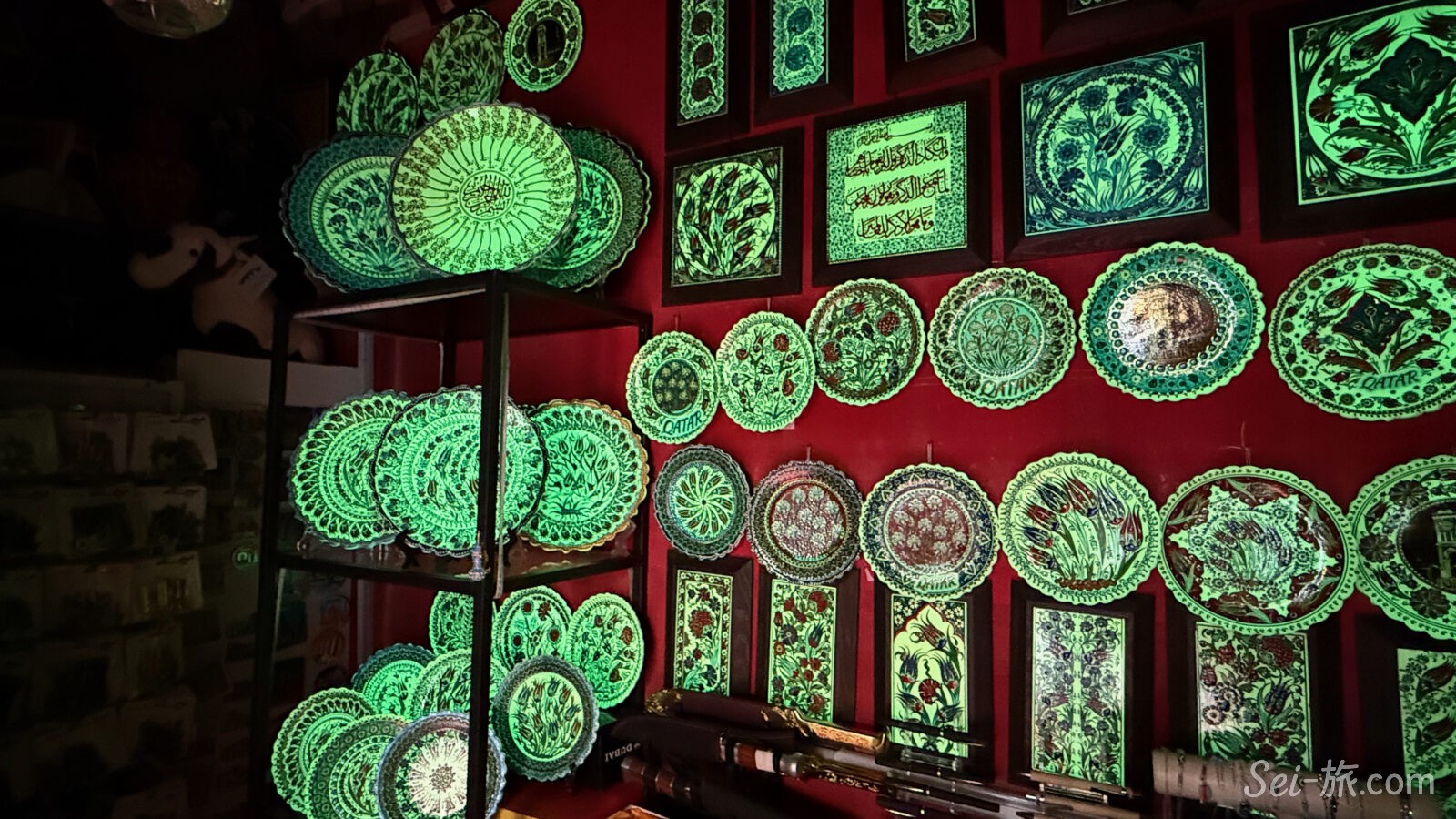 暗闇の中に浮かび上がる、緑色の光を放つアラビア模様のディッシュ。