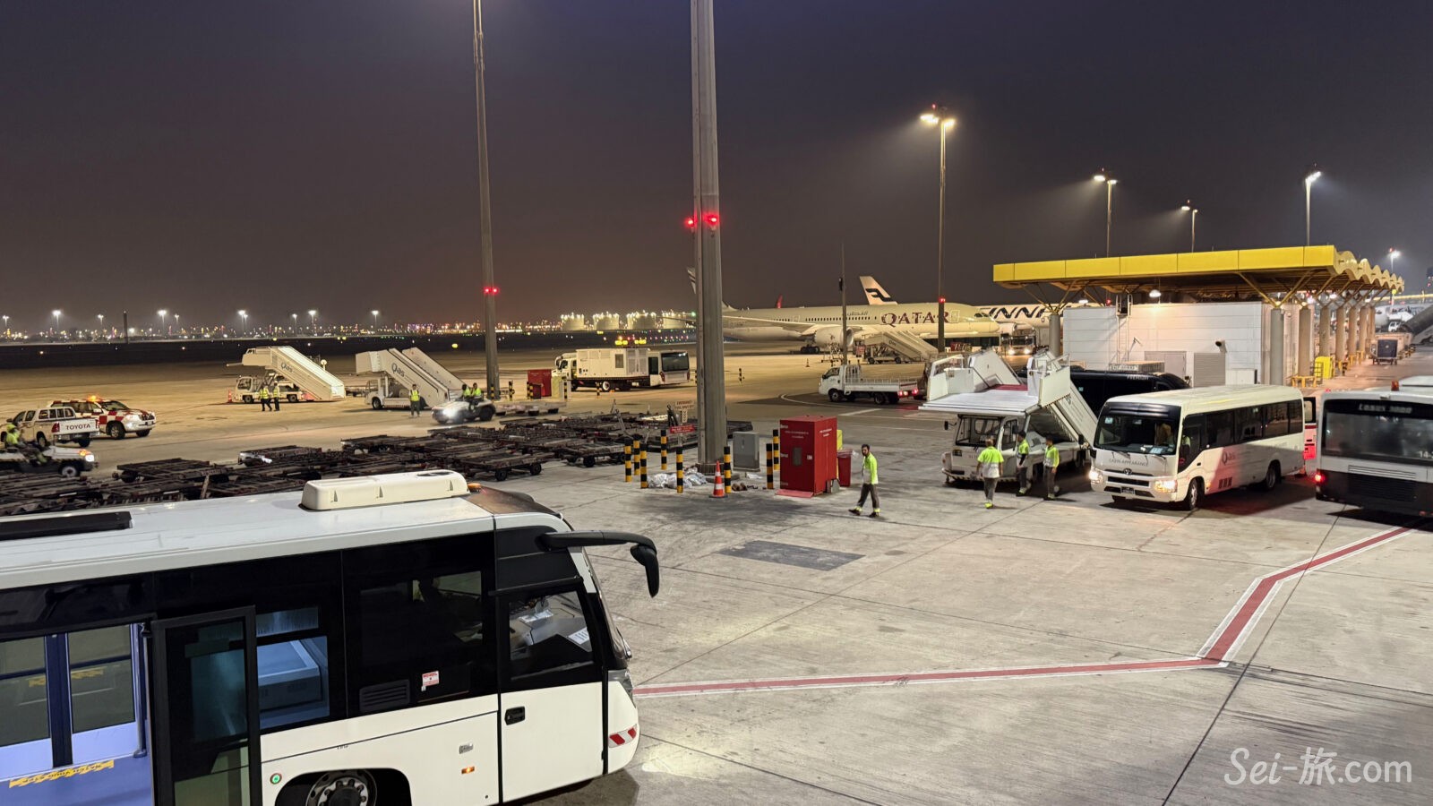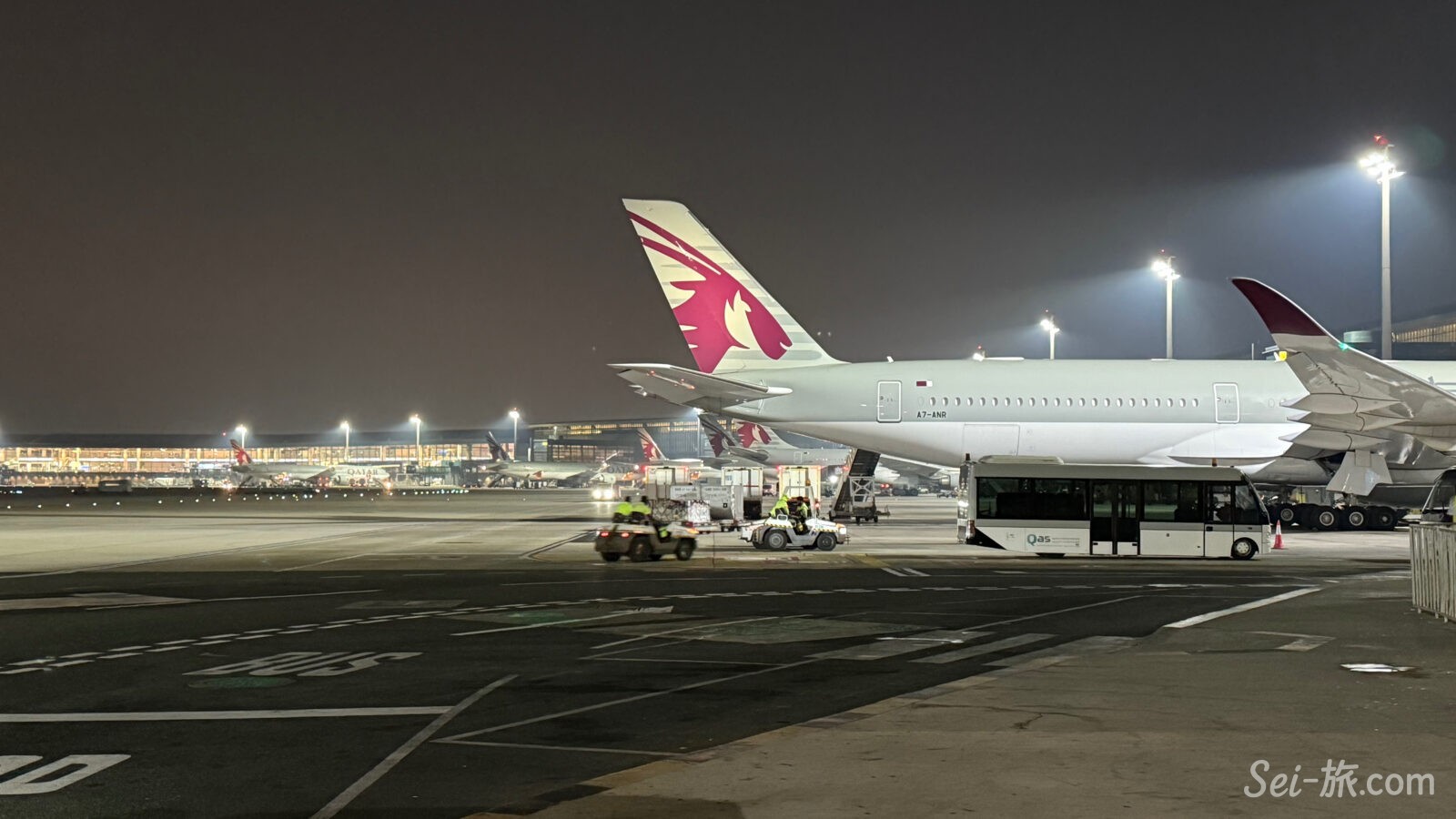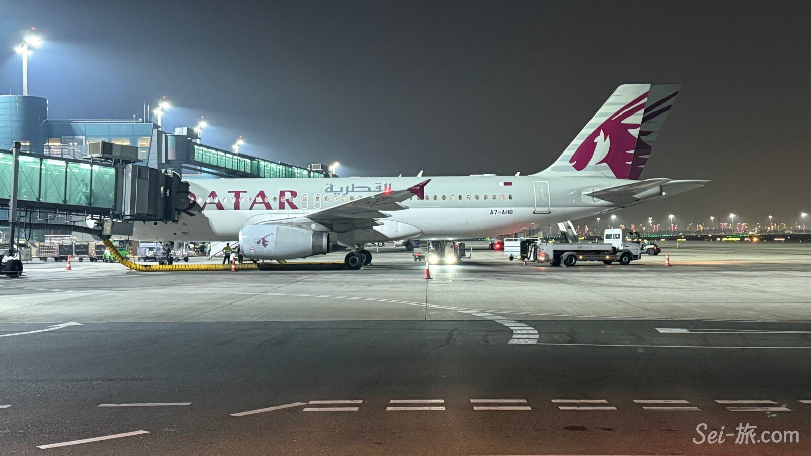 カタール航空のシックな色彩の機体は、ハマド国際空港の未明の灯りの下がとてもよく似合うと思う。