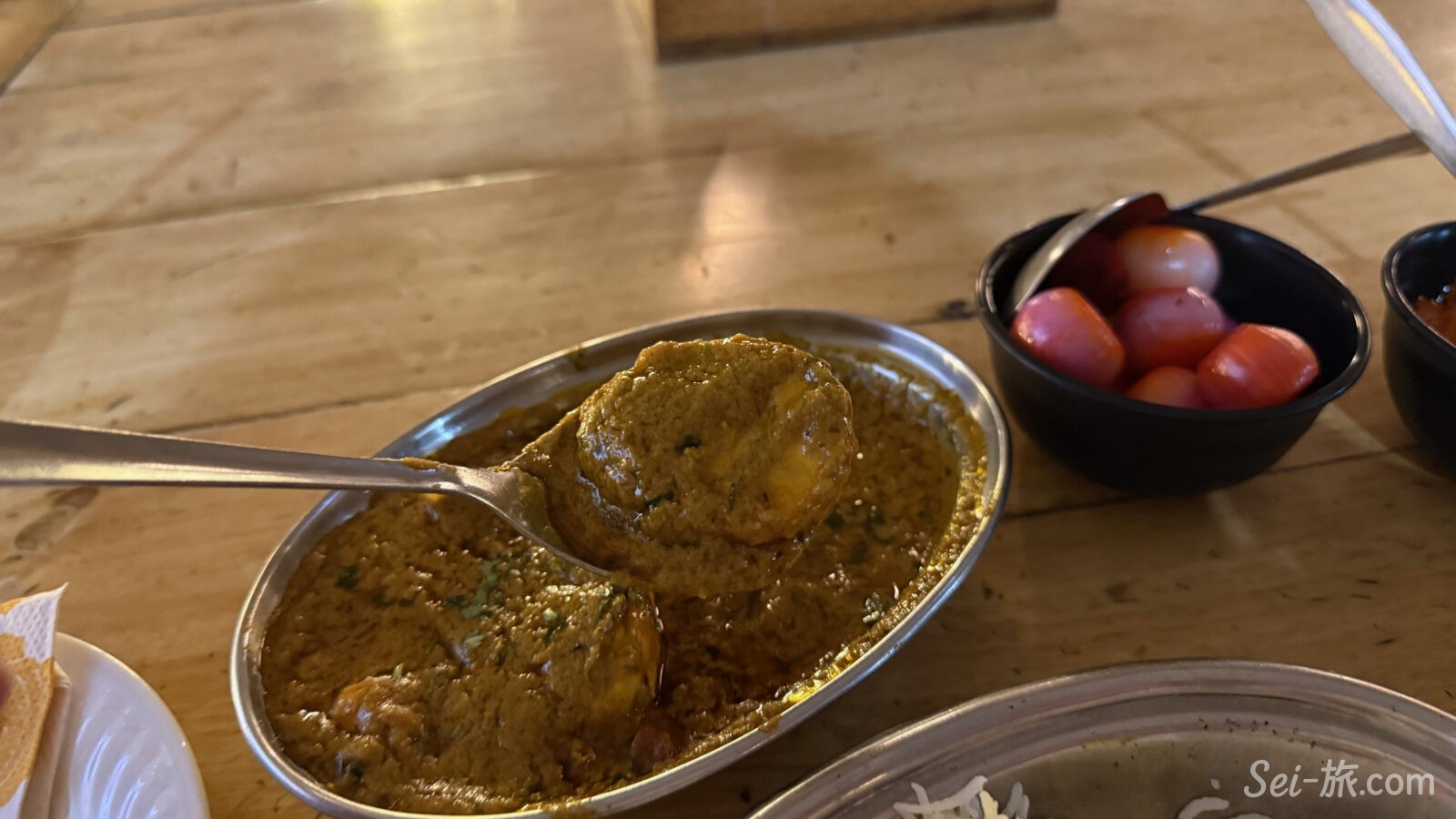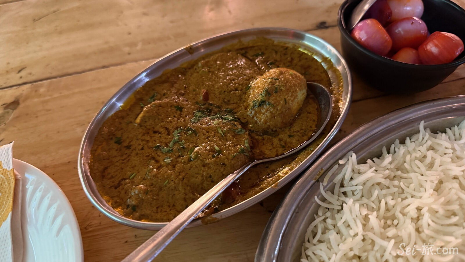 半熟気味のゆで卵がふたつに割られ、無造作にルーに放り込まれてあるだけのカレー。