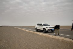 早朝の砂漠。クルマで走っていると、どこか現実離れている気分。2年前、ヌビア砂漠をクルマで駆け抜けた記憶が、脳裏をよぎります。